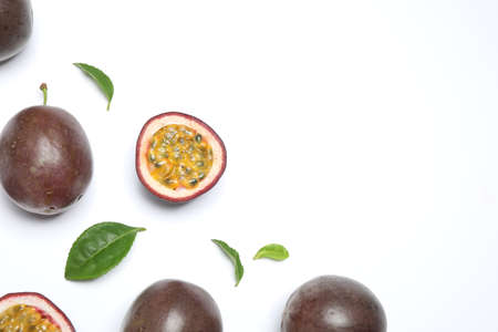 Fresh ripe passion fruits (maracuyas) with leaves on white background, flat lay. Space for text
