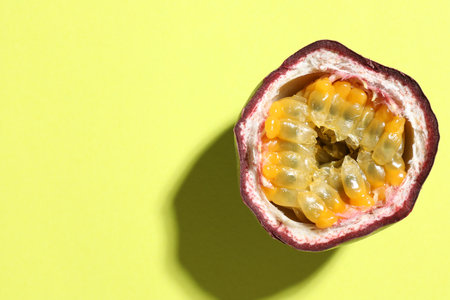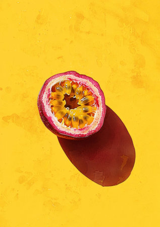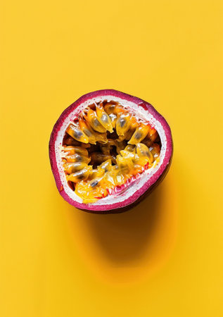 Half of a passion fruit on a vibrant yellow background, showcasing its juicy seeds and textured rind The fruit casts a soft shadow creating depth