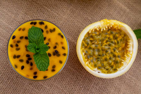 Passion fruit smoothie with passion fruit sliced in glass.