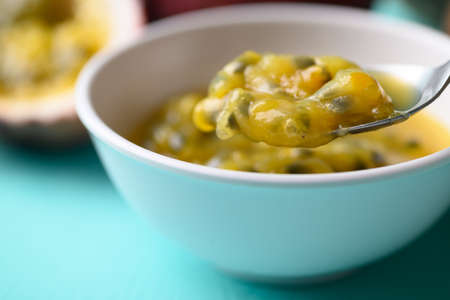 Passion fruit juice in bowl with spoon for eating on pastel color background, Tropical fruit in summer season