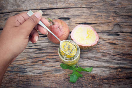 Close up juice jar from soft pulp and seeds inside passion fruit or passiflora edulis, a kind of seedy fruit that nutrition, delicious on hard rind background
