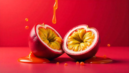 AI Generated. passion fruit halves - vibrant red pulp and seeds