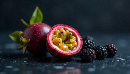Passion fruit and blackberries arranged on dark reflective surface