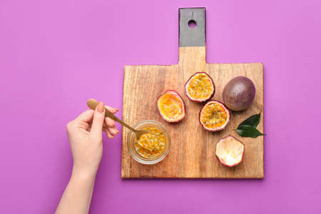 Woman eating delicious passion fruits on purple background