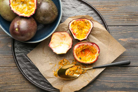 Plate and bowl with delicious passion fruits on wooden background