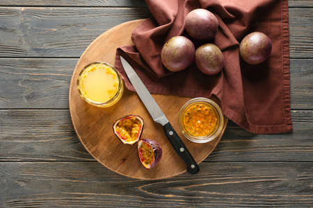 Glass of juice and board with delicious passion fruits on wooden background