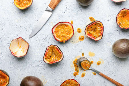 Delicious cut passion fruits, spoon and knife on light background