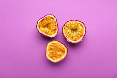 Delicious cut passion fruit on purple background