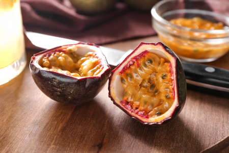 Board with cut passion fruit, closeup