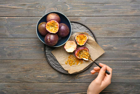 Woman eating delicious passion fruits on wooden background