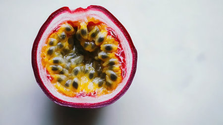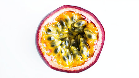 Discover the beauty of a halved passion fruit, showcasing its vibrant seeds and juicy pulp, perfect for health foods, desserts, or culinary presentations.