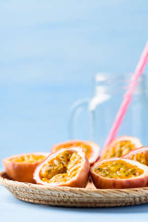 Passion fruit from local market on blue background, Tropical fruit in spring and summer season