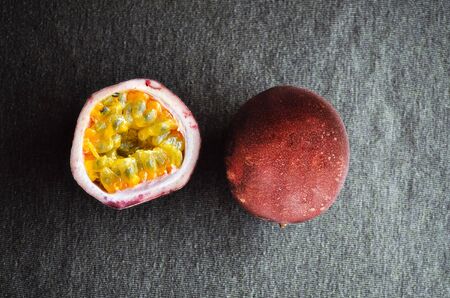 Passion Fruit from farm, Passion fruits half with juice, photo top view split-toned.