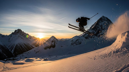 A skier performs an exhilarating jump, captured in mid-air against a backdrop of majestic snow-covered mountains. The vibrant watercolor background adds to the adventurous scene.