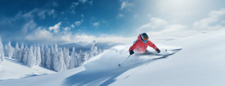 A skilled skier in a red jacket glides down a snowy mountain, leaving waves of powder on a breathtaking winter day.