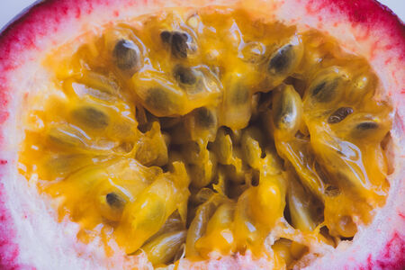 Closeup of a passion fruit cut in half