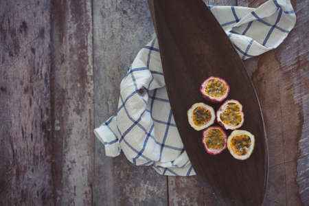 Cut passion fruit on texturized wooden background. Healthy breakfast photo. Rural kitchen and tropical fruits. Rustic wooden background with space for your text.
