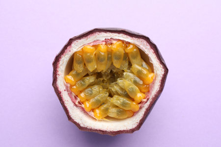 Delicious cut passion fruit on purple background