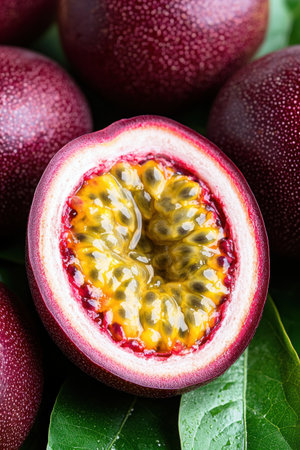 AI Generated. passion fruit halves - vibrant red pulp and seeds