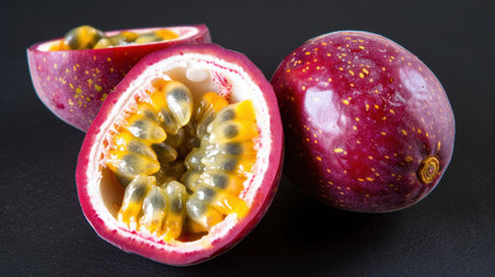 This image showcases fresh purple passion fruit, beautifully halved to reveal its juicy seeds. Perfect for culinary projects, healthy lifestyle themes, and vibrant food photography.