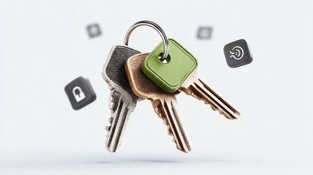 Close up of modern metallic keys on a vibrant orange background with white stripes, suggesting security and access to new opportunities
