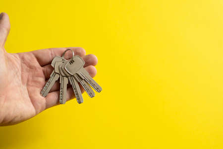 Mens hand holding a set of keys with a yellow background. Realtor with a keys to an apartment for a clients. Focus on the keys. Bunch of keys in a realtors hand.