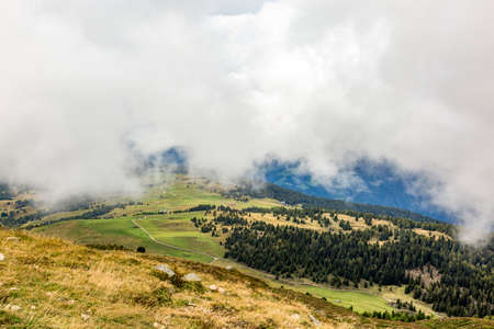 Panoramic view near Frauenkogel on the mountain peaks covered in clouds in the Karawanks, Carinthia, Austria. Borders with Slovenia. Triglav National Park. Looking on mount Hochstuhl( Stol). Freedom