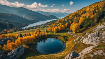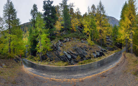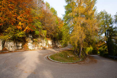 Hairpin bend with autumn landscape, tarmac road . Colorful trees