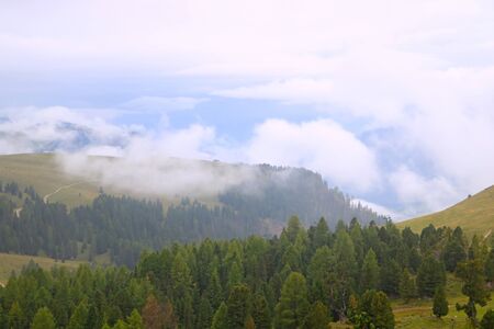 Landscape with beautiful Autumn yellow and green pine trees at the fields of Alpe di siusi Dolomite in South Tyrol in Italy