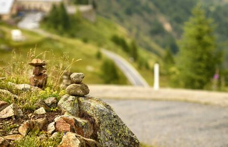 Stones stacked as a Zen memorial along a mountain road, a township in the background blurred and indistinguishable.