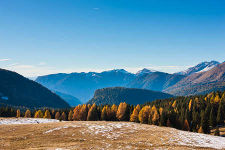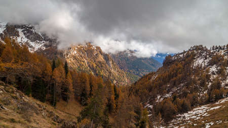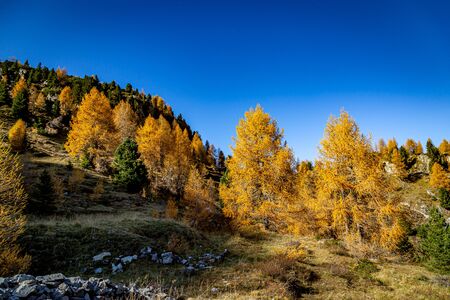 Majestic autumn alpine scenery with colorful larch forest, Switzerland