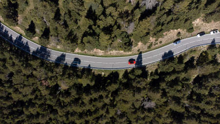 This aerial view showcases the captivating serpentine roads of the Alps, surrounded by lush forests. The curves create a scenic route perfect for a roadtrip adventure.