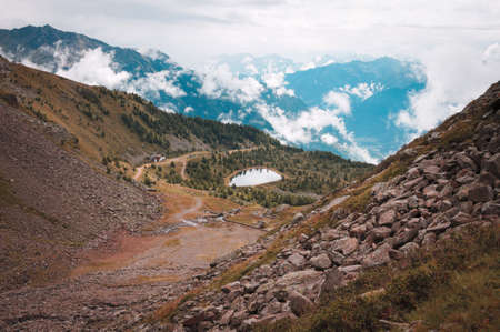 MONNO, ITALY, SEPTEMBER 10, 2020 - View of Mortirolo Pass. It is an alpine pass in the Rhaetian Alps, in Lombardy, which connects Valtellina (Sondrio province) with Val Camonica (Brescia province), through Mazzo of Valtellina and Monno towns.