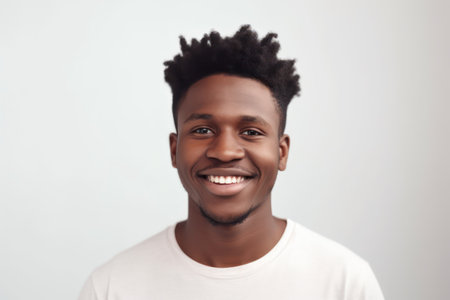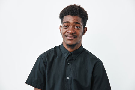 Young black man with dark skin and curly hair wearing black shirt smiling and looking at camera on white background. Portrait of confident african ethnicity male with casual style.