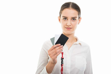 Portrait of young pretty business woman showing three blank name tag isolated on white background with copy space advertising area