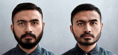 Closeup portrait of serious man with beard standing and looking focused and confident at camera. special striped lines designed and looking different. indoor studio shot isolated on orange background