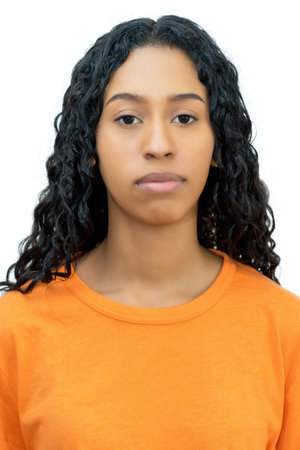 Passport photo of serious south american young adult woman isolated on white background for cut out