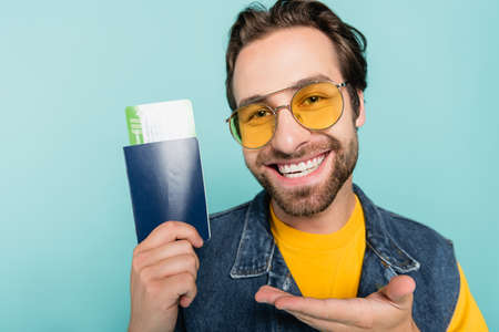 Smiling man in sunglasses pointing at passport and air ticket isolated on blue