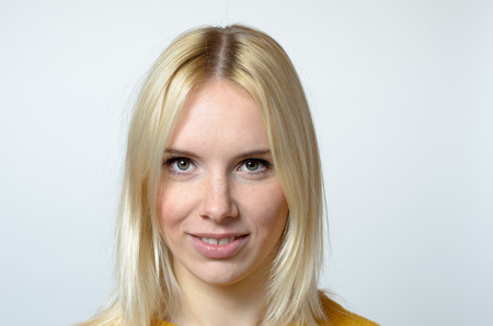 Close Up friendly Pretty Face of a Blond Young Woman Staring at the Camera Against Gray Wall Background