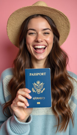 Portrait of a happy smiling young woman holding passport and usa dollar money isolated over blue background - image