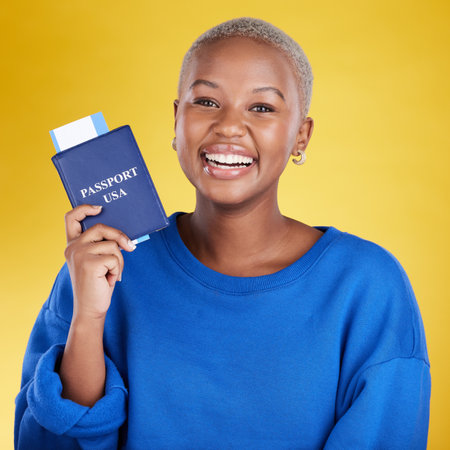 Happy woman face with passport isolated on yellow background for USA travel opportunity, immigration or holiday. Identity documents, flight ticket and excited portrait of young black person in studio