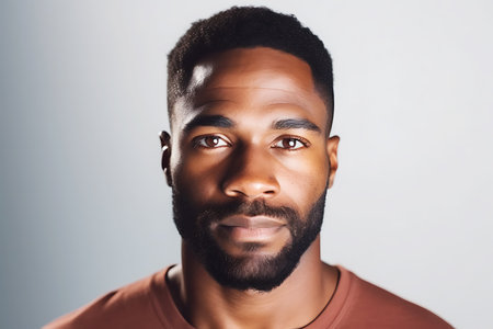 A young African-American man in a brown t-shirt poses against a gray background. man looking at camera. horizontal photo