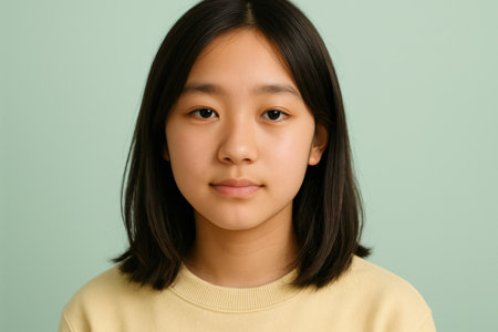 Calm young girl with straight black hair wearing a yellow sweater, posing indoors against a plain pastel green background.