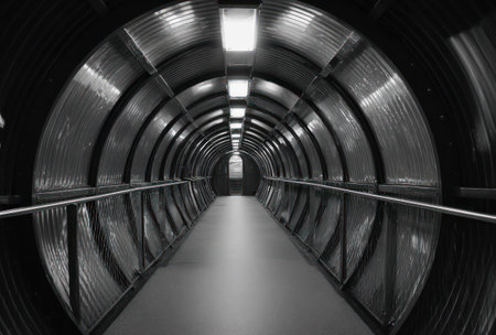 A grayscale, curved tunnel with a walkway and ceiling lights, vanishing point perspective