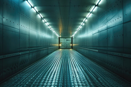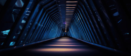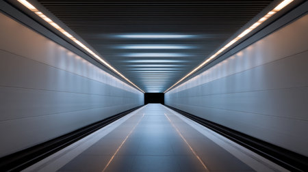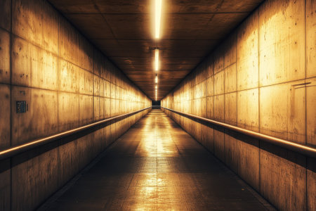 AI Generated. Long tunnel illuminated with lights on both sides creating a pathway effect