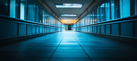 A long hallway with glass walls and teal-colored lighting. Blurred figures of people are walking towards the camera, creating a sense of motion. The architecture is modern and sleek, with a futuristic feel. The lighting reflects off the glass, creating a sense of depth and perspective.