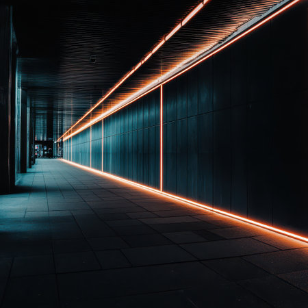 A sleek corridor features glowing neon lights along the walls creating a striking contrast against the dark architecture during night hours.