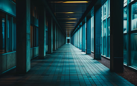 Long hallway showcases a series of lights and shadows, emphasizing symmetry and depth in a contemporary structure during evening hours.
