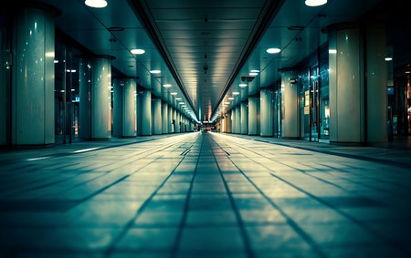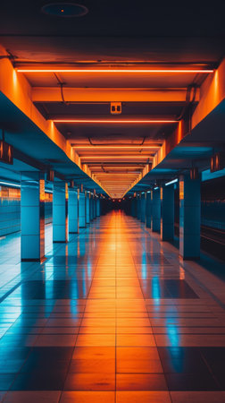 The warm glow of an illuminated transit corridor with sleek lines, reflecting on the polished floor for a modern and urban feel