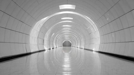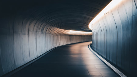 This image features a sleek, modern tunnel with illuminated walls and a dark exit, representing journeys and transitions in a minimalist environment.
